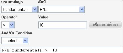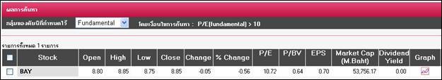 ต้องการค้นหาข้อมูลประเภท Fundamental ดัชนี PE > 10 ของหลักทรัพย์กลุ่มธนาคาร