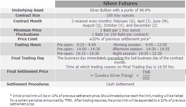 TFEX has defined the characteristics and specifications for Silver Futures, as follow: