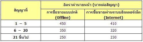 การจัดเก็บค่านายหน้าเป็นแบบขั้นบันไดโดยนับย้อนไปตั้งแต่สัญญาที่หนึ่ง (Sliding Scale First Contract) ตามจำนวนสัญญาต่อวัน (ยังไม่รวมภาษีมูลค่าเพิ่ม) สำหหรับการซื้อขายแบบปกติ (Offline) และการซื้อขายผ่านระบบอินเตอร์เน็ต (Internet) ดังนี้