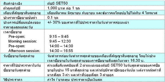 สำหรับ SET50 Index Futures นั้น บมจ. ตลาดอนุพันธ์ได้กำหนดลักษณะและเงื่อนไขดังนี้