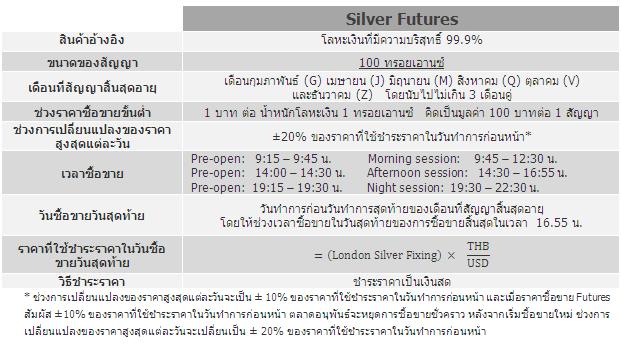 โลหะซึ่งเป็นสินค้าอ้างอิงของ Silver Futures คือโลหะเงินที่มีความบริสุทธิ์ 99.9%