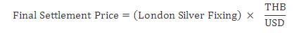 ใช้ราคา London Silver Fixing เป็นราคาอ้างอิงในการคำนวณ Final Settlement Price โดยปรับสกุลเงิน USD เป็นบาท หรือสามารถสรุปเป็นสูตรดังนี้